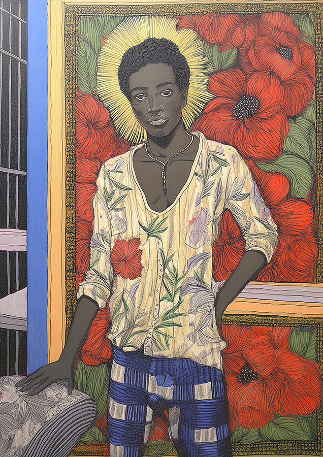 A figure stands between a barred window and a field of red flowers. The sun forms a halo behind the head, while patterns travel like quiet strings across cloth and wall. The cage is architectural, but also atmospheric. Light filters through restraint. The flowers press close, as if growing toward the body. In this symbiotic space, confinement and radiance coexist. The self absorbs both—the bars, the threads, the sun—becoming a meeting point where limitation and light root into one another.