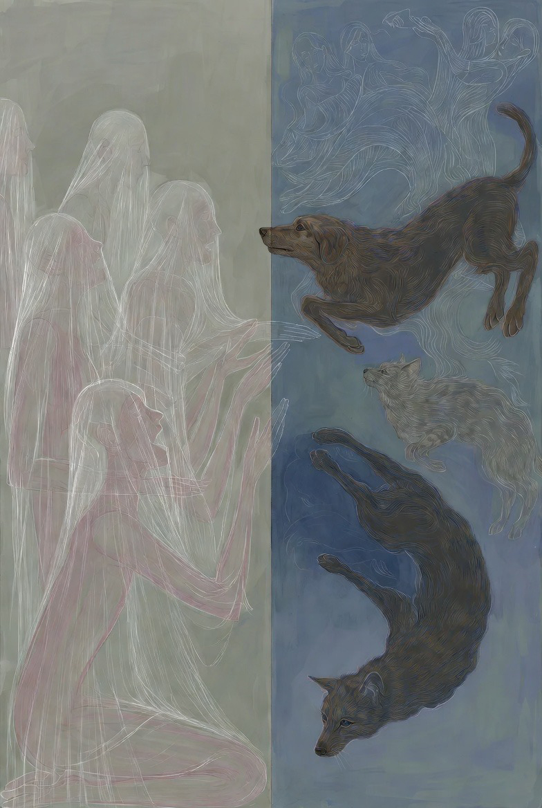 on one side, her iconic women in veils reciting poetry. On the other, my floating upside-down animals listen silently. Somewhere in between, meaning flickers.