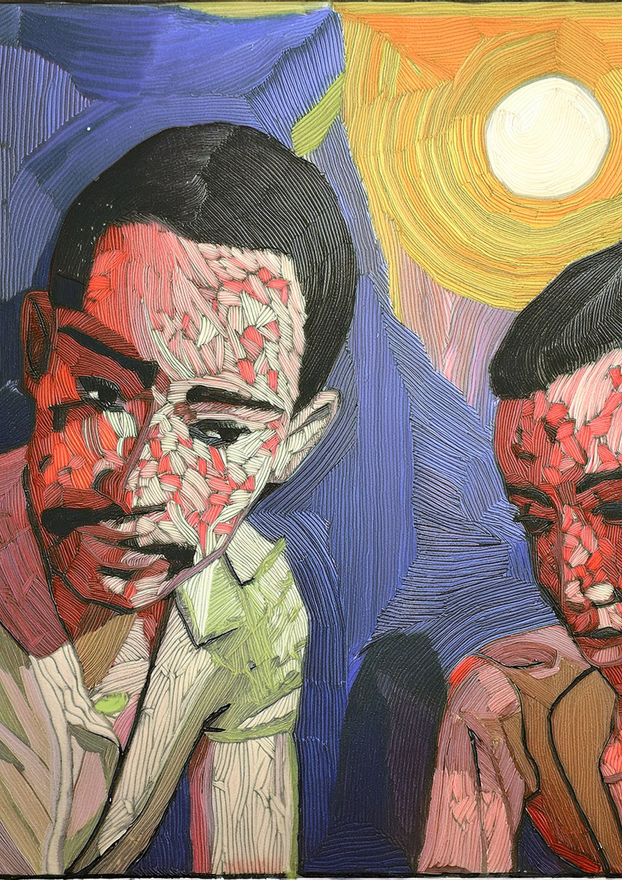 Two figures sit where day meets night. Their faces are not solid, but growing—made of small, living strokes that feel like petals or cells. Light and darkness do not surround them; they move through them. The sun becomes part of their skin, and shadow settles inside their features. In this space, identity is not separate from the world. It is shaped by it—constantly blooming between warmth and shade.